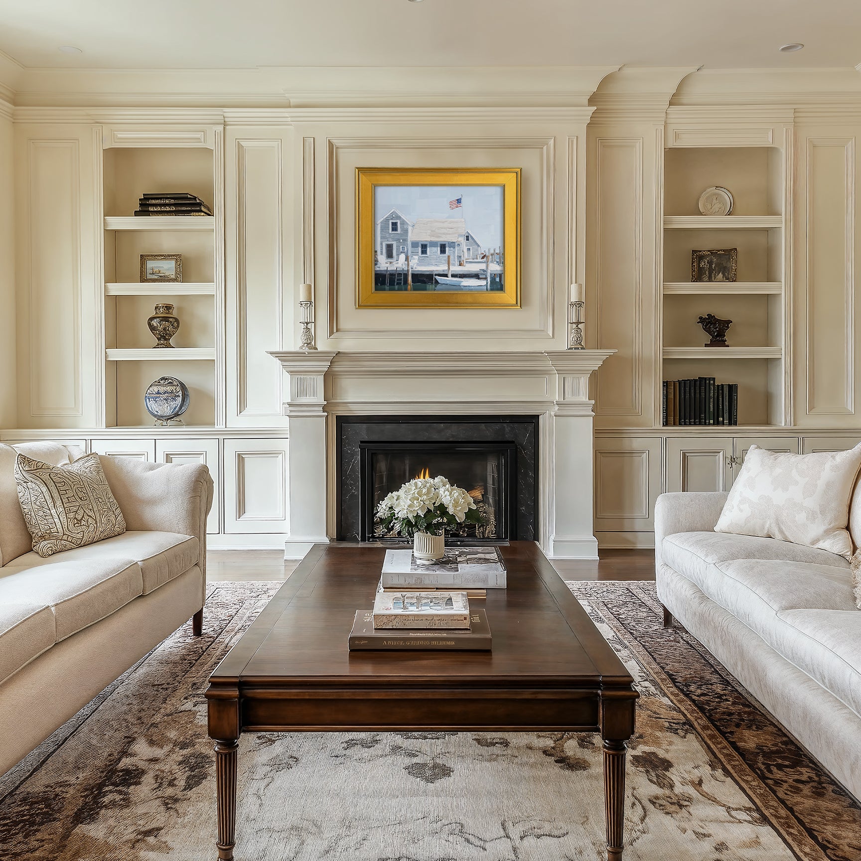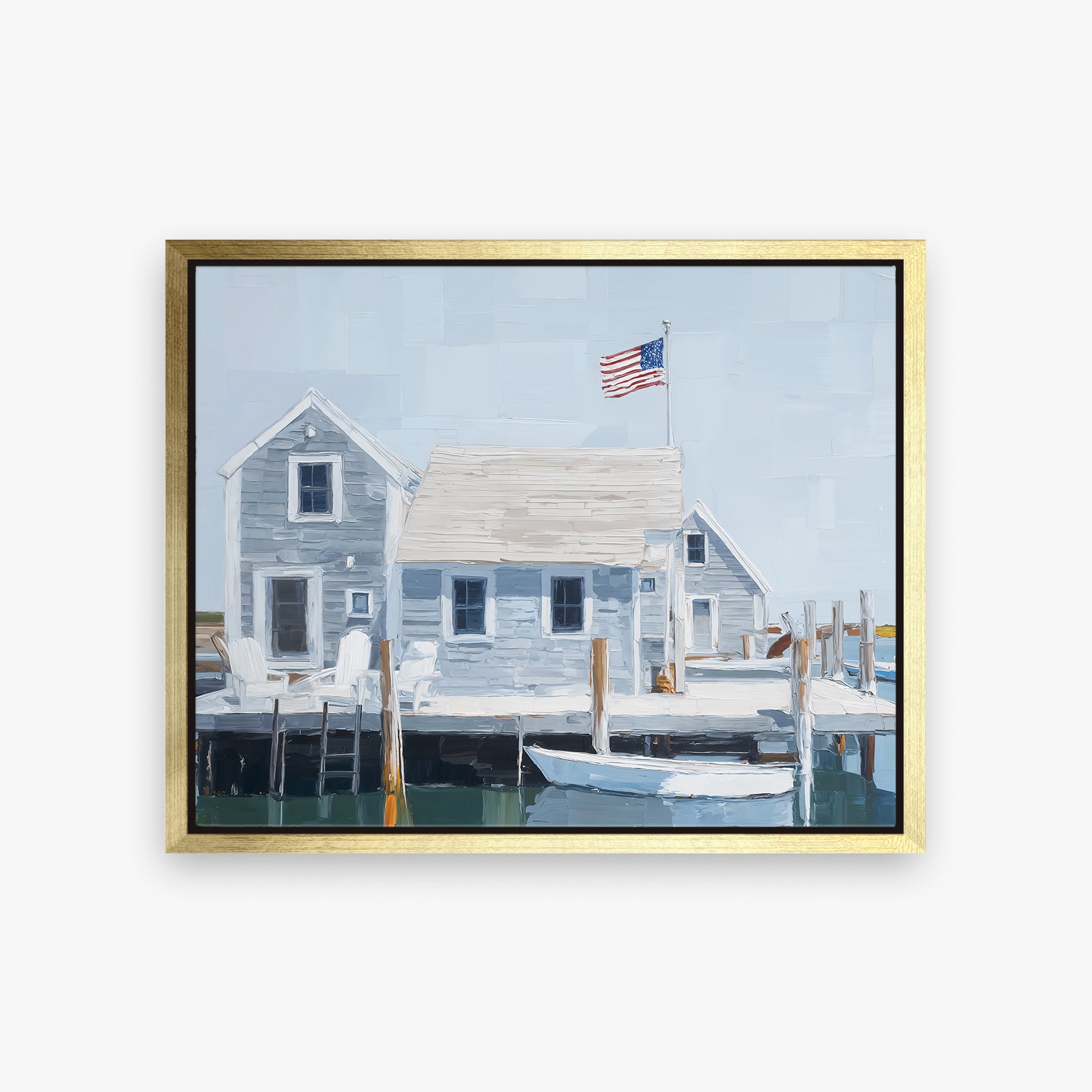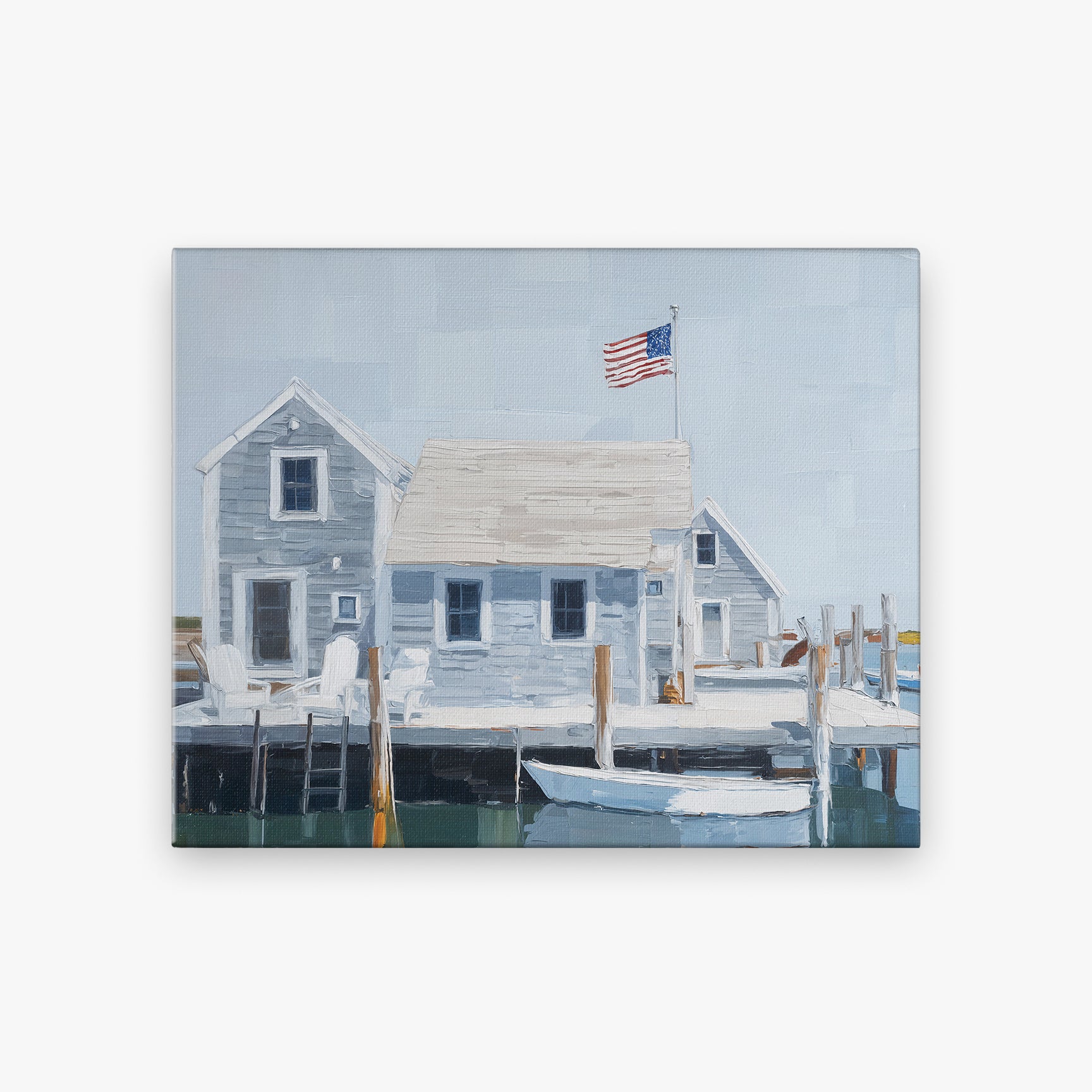 Breezy, bright, and unmistakably coastal, Nantucket Island captures the charm of seaside Americana with painterly elegance. Weathered gray cottages, crisp white trim, and a gently waving American flag set the scene—anchored by a still harbor and a waiting boat. This oil painting evokes the slow rhythms of island life, salt air, and summer days spent by the water.