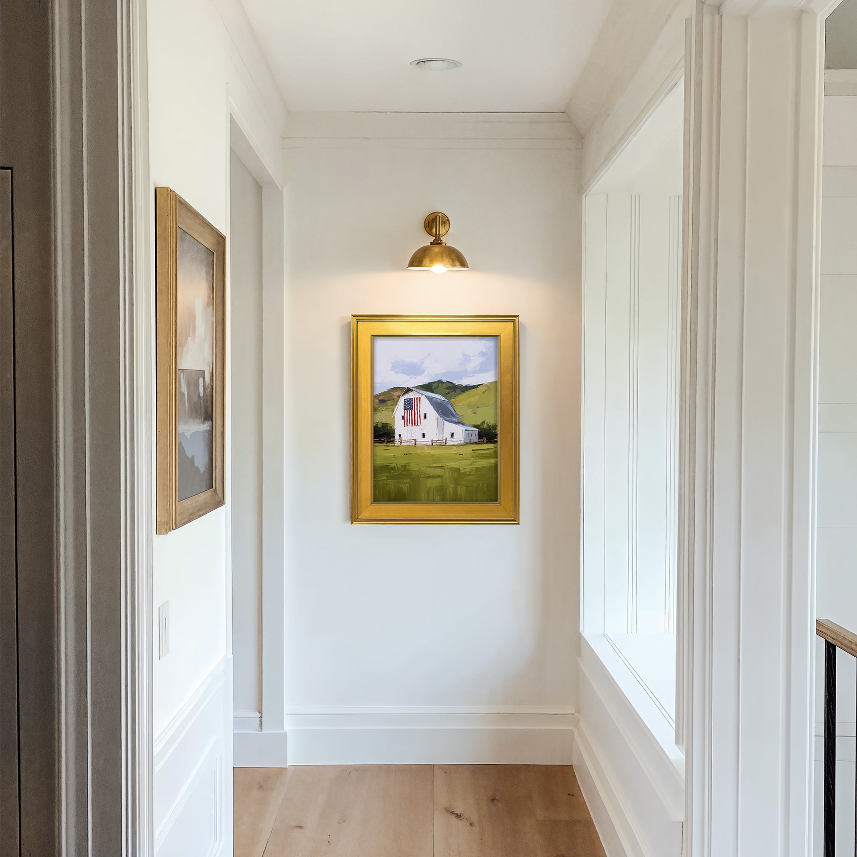 A portrait of rural pride, Stars and Stripes Barn captures a classic white barn set against rolling green hills—its bold American flag standing tall and unmistakable. With rich texture and confident brushwork, this piece is a tribute to the land, the heartland, and the quiet strength of small-town America.